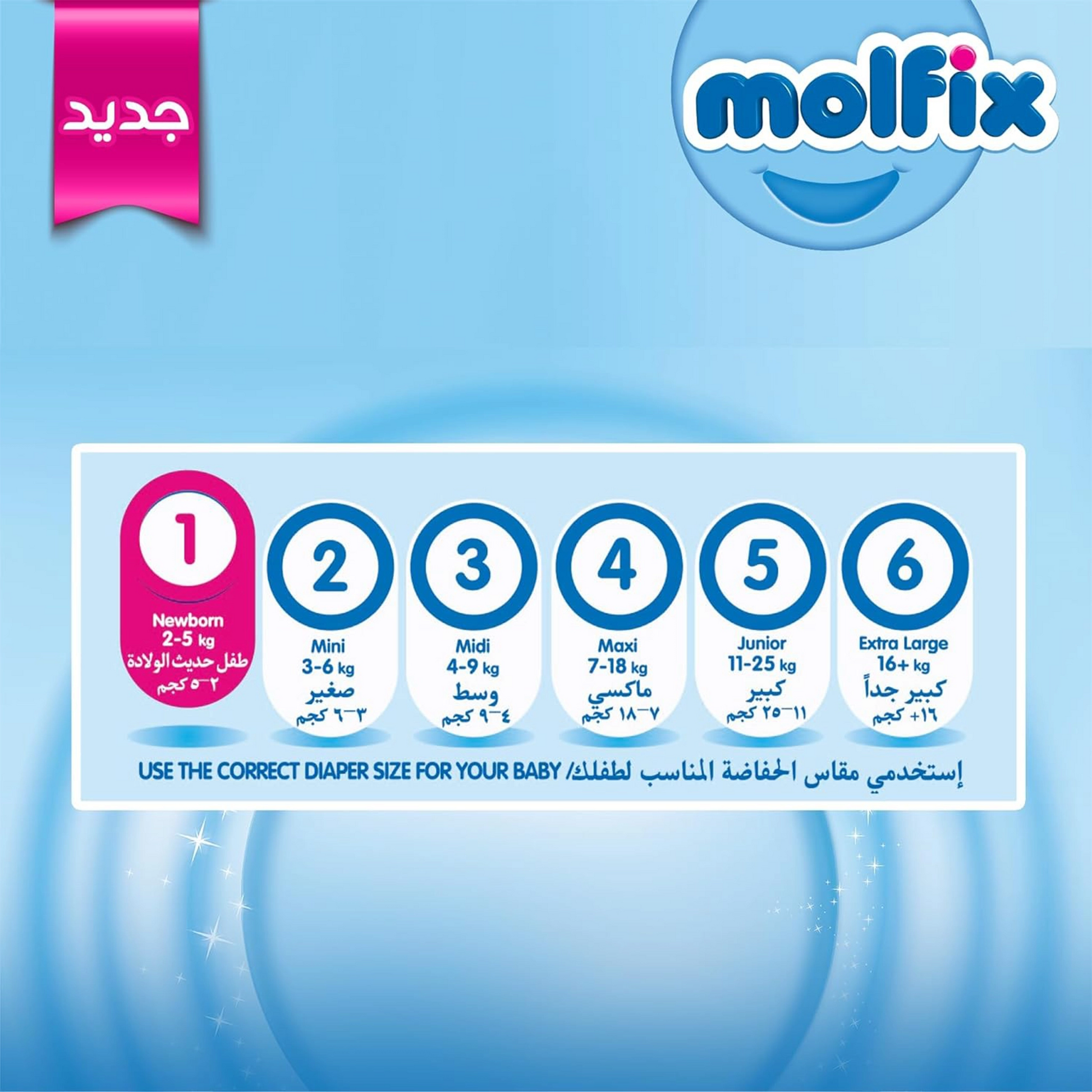 Molfix the driest diaper in Egypt New Molfix is sterilized with UVC and Anti bacterial technologies to provide more protection for your baby. Molfix does not sag while absorbing the liquid and protects its shape. Making your baby move easily. Elastic Body System, Elastic Side Bands, Anti-Leakage Elastic Barriers, Double Absorbent Area.