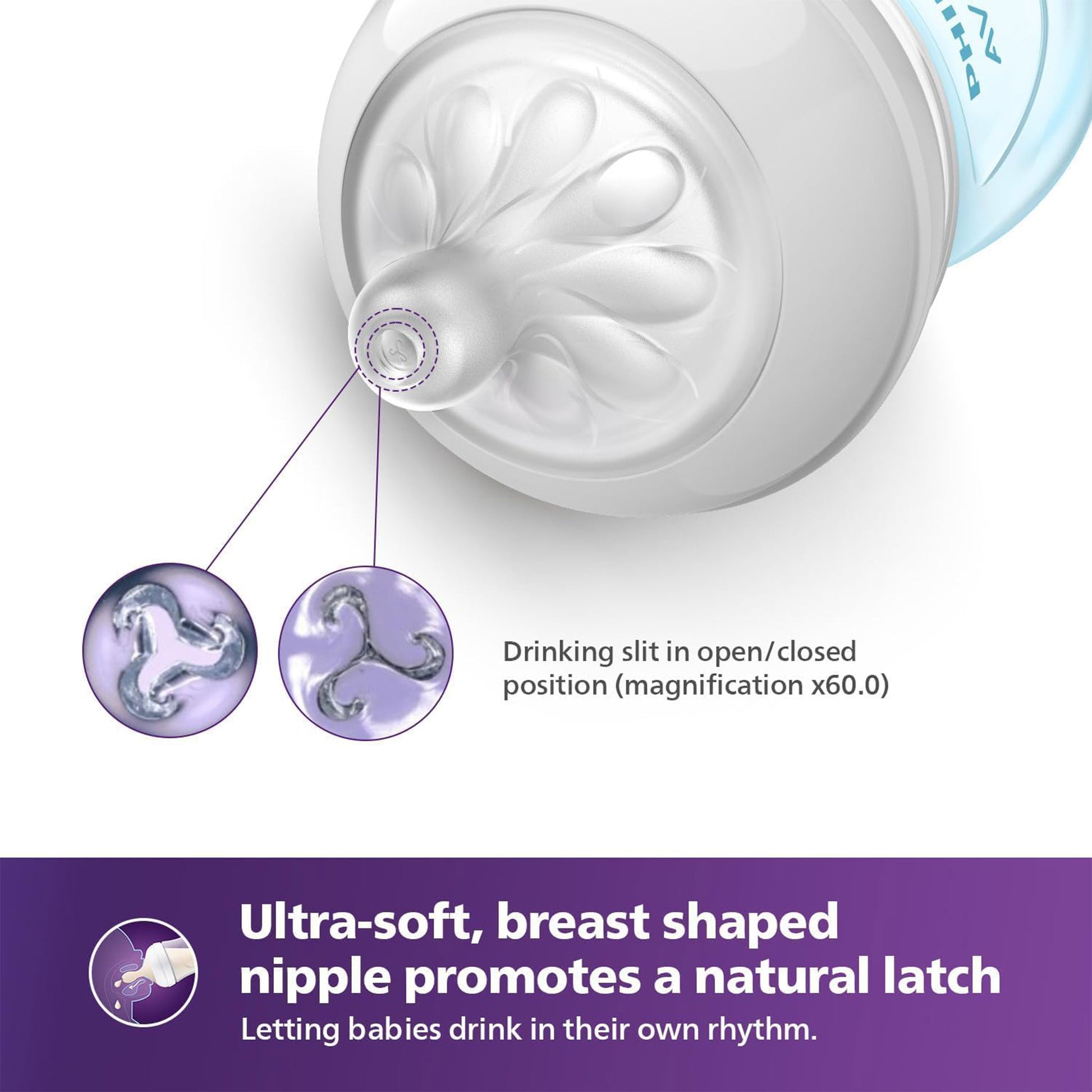 Natural Response nipple: The unique Philips Avent bottle nipple opening only releases milk when the baby actively drinks.