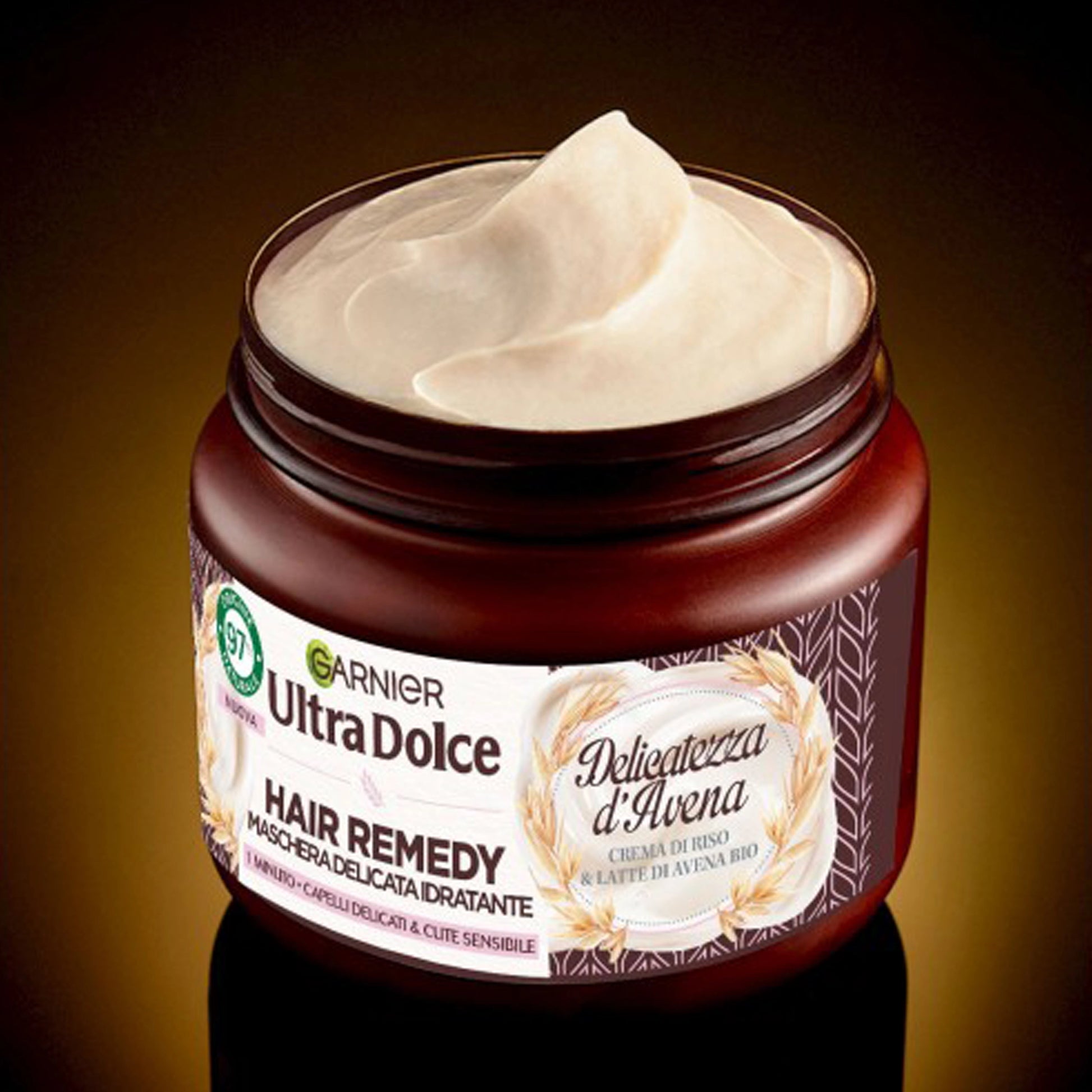 Discover the new 1 minute* Delicate Moisturizing mask by Ultra Dolce Delicatezza d`avena, with a formula enriched with Rice Cream and Organic Oat Milk. Our delicate, hydrating & hypoallergenic remedy acts as a protective shield for more hydrated, soft & healthy-looking hair. A true sensory moment for you: apply our remedy generously to wet hair, wait a minute & rinse! Thanks to the new formula, from the first minute of application, your hair appears 3 times more hydrated**. Without silicones, artificial colorants and ingredients or derivatives of animal origin.