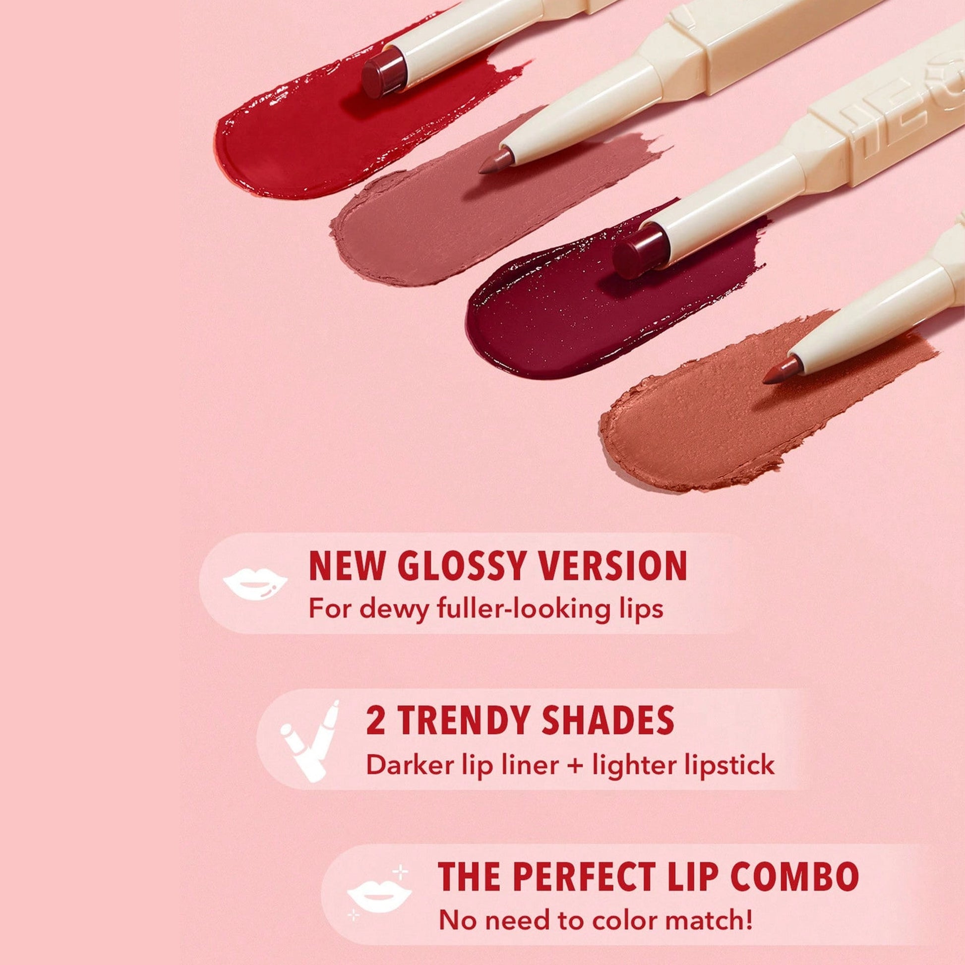 Our new glossy version features a silky dewy lip color and smooth lip liner