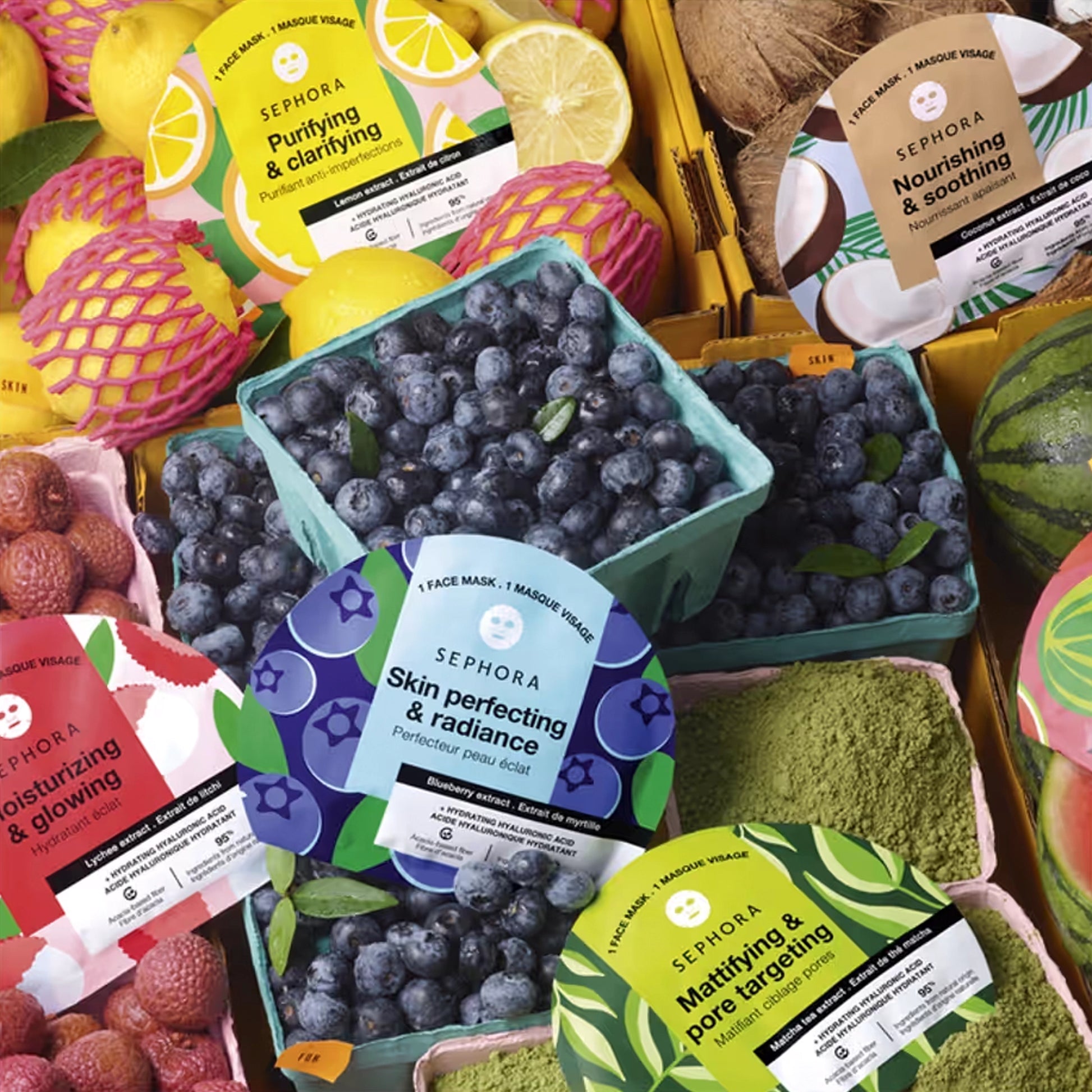 Coconut - Nourishing & Soothing Ingredients : Aqua (Water), Butylene Glycol, 1,2-Hexanediol, Hydroxyacetophenone, Glycerin, Sodium Polyacrylate, Polyglyceryl-10 Laurate, Parfum (Fragrance), Sorbitan Caprylate, Xanthan Gum, Ananas Sativus (Pineapple) Fruit Extract, Lecithin, Sodium Hyaluronate, Sodium Dilauramidoglutamide Lysine, O-Cymen-5-Ol, Vaccinium Myrtillus Fruit Extract. Blueberry - Skin Perfecting & Radiance Ingredients : Aqua (Water), Butylene Glycol, Glycerin, 1,2-Hexanediol, Hydroxyacetophenone, Sodium Polyacrylate, Polyglyceryl-10 Laurate, Parfum (Fragrance), Sorbitan Caprylate, Xanthan Gum, Lecithin, Kaolin, Cyperus Rotundus Root Extract, Sodium Hyaluronate, Sodium Dilauramidoglutamide Lysine, O-Cymen-5-Ol, Camellia Sinensis Leaf Extract. Lemon - Purifying & Clarifying Ingredients : Aqua (Water), Butylene Glycol, Glycerin, 1,2-Hexanediol, Hydroxyacetophenone, Sodium Polyacrylate, Polyglyceryl-10 Laurate, Glycosyl Trehalose, Parfum (Fragrance), Sorbitan Caprylate, Hydrogenated Starch Hydrolysate, Lecithin, Xanthan Gum, Sodium Hyaluronate, Sodium Dilauramidoglutamide Lysine, Camellia Japonica Leaf Extract, Litchi Chinensis Seed Extract, O-Cymen-5-Ol. Matcha - Mattifying & Pore Targeting Ingredients : Aqua (Water), Butylene Glycol, 1,2-Hexanediol, Hydroxyacetophenone, Glycerin, Sodium Polyacrylate, Polyglyceryl-10 Laurate, Sorbitan Caprylate, Xanthan Gum, Lecithin, Parfum (Fragrance), Kaolin, Cyperus Rotundus Root Extract, Sodium Hyaluronate, Sodium Dilauramidoglutamide Lysine, Citrus Limon (Lemon) Fruit Extract, O-Cymen-5-Ol. Watermelon - Quenching & Plumping Ingredients : Aqua (Water), Butylene Glycol, Polyglyceryl-6 Stearate, Cocos Nucifera (Coconut) Fruit Extract, Glycerin, 1,2-Hexanediol, Hydroxyacetophenone, Cetearyl Alcohol, Hydrogenated Ethylhexyl Olivate, Citrullus Lanatus (Watermelon) Fruit Extract, Polyglyceryl-6 Behenate, Parfum (Fragrance), Sodium Polyacrylate, Tocopherol, Helianthus Annuus (Sunflower) Seed Oil, Sorbitan Caprylate, Glycolipids, Lecithin, Xanthan Gum, Sodium Hyaluronate, Hydrogenated Olive Oil Unsaponifiables, Cocos Nucifera (Coconut) Oil, O-Cymen-5-Ol, Gardenia Taitensis Flower. Lychee - Moisturizing & Glowing Ingredients : Aqua (Water), Butylene Glycol, Glycerin, Rice Ferment Filtrate, 1,2-Hexanediol, Hydroxyacetophenone, Sodium Polyacrylate, Parfum (Fragrance), Polyglyceryl-10 Laurate, Sorbitan Caprylate, Citrullus Lanatus (Watermelon) Fruit Extract, Lecithin, Xanthan Gum, Sodium Dilauramidoglutamide Lysine, O-Cymen-5-Ol, Sodium Hyaluronate.