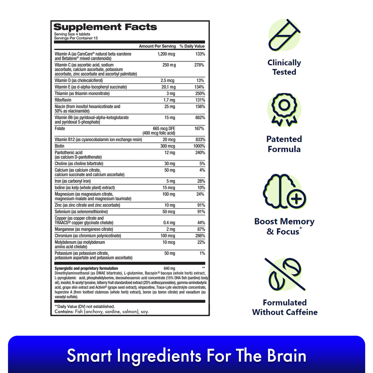 Focus Factor Original Brain supplement is one of our wide range of products that provides you with complete daily nutrients. Our tablets are enriched with a potent combination of vitamins, minerals, and neuronutrients, including beta carotene and bacopa, which will not only act as a brain supplement but can also replace your daily multivitamins. Help support your brain with Focus Factors supplements to maximize concentration, focus, and memory. Information Warning: Accidental overdose of iron-containing products is a leading cause of fatal poisoning in children under 6 years of age. Keep this product out of reach of children. In case of overdose, call a doctor or medical center immediately. *These statements have not been evaluated by the Food and Drug Administration. This product is not intended to diagnose, treat, cure, or prevent diseases, including ADHD and Alzheimer's. This product is labeled according to United States standards and may differ from similar products sold elsewhere in its ingredients, labeling, and allergen warnings. Ingredients Vitamin A (as natural beta-carotene and mixed carotenoids), Vitamin C (as ascorbic acid, sodium ascorbate, calcium ascorbate, potassium ascorbate, zinc ascorbate and ascorbyl palmitate), Vitamin D (as cholecalciferol), Vitamin E (as natural d-alpha-tocopheryl succinate), Thiamine (as natural thiamine), Thiamine (as thiamine mononite amino rate), riboflavin, niacin (from inositol hexanicotinate and 50% as niacinamide), vitamin B6 (as pyridoxal-alpha-ketoglutarate, pyridoxal 5-phosphate), folate, vitamin B12 (as ion exchange resin), biotin, pantothenic acid (as calcium d - pantothenate), Choline (as choline bitartrate), calcium (as calcium citrate, calcium succinate and ascorbate calcium), iron (as carbonyl iron), magnesium (as magnesium citrate, magnesium malate, and magnesium taurinate), zinc (as zinc citrate and zinc ascorbate), selenium (as selenomethionine), copper